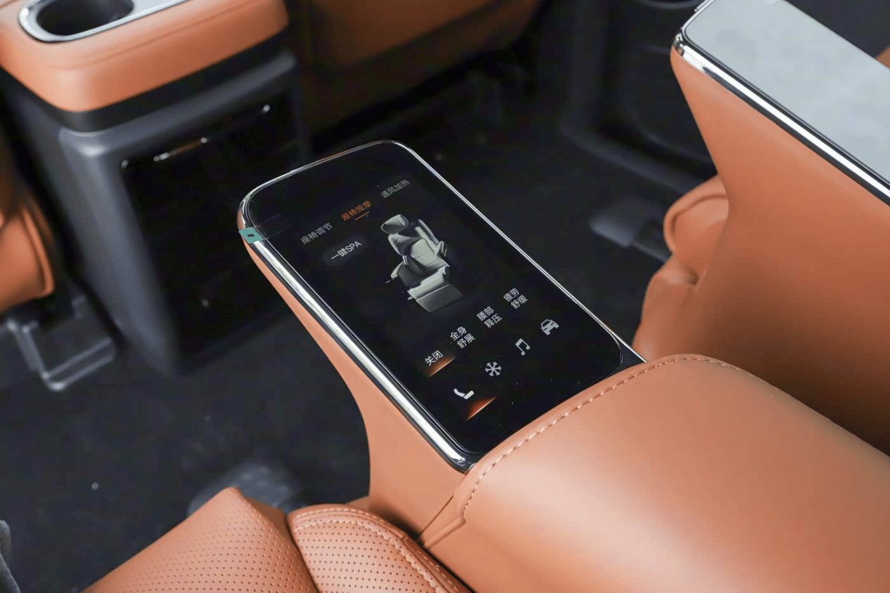 在二排零重力座椅的扶手端,配有一块5英寸的智能控制屏。这块屏幕可以实现“一键SPA”功能控制,并且对座椅放倒舒展、按摩等功能特定联动。很显然,智能座舱的技术进步,也为高端MPV的二排贵客带来了更加高端、舒适的乘车享受。
